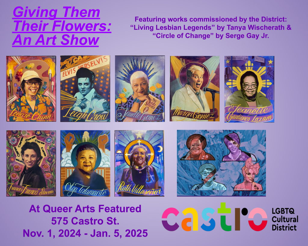 Featuring works commissioned by the Castro LGBTQ Cultural District. “Living Lesbian Legends” by Tanya Wischerath & “Circle of Change” by Serge Gay Jr. At Queer Arts Featured (QAF), 575 Castro St., Nov. 1, 2024 – Jan. 5, 2025. Curated by Tina Aguirre.