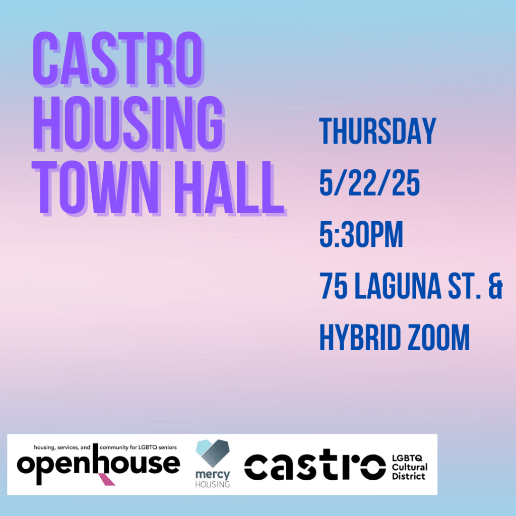 You’re invited to the Castro Housing Town Hall: Co-hosted by Castro LGBTQ Cultural District, Openhouse SF and Mercy Housing on May 22, 5:30pm at 75 Laguna Street with Rich Hillis, Director of SF Planning, Senator Scott Wiener, Sup. Rafael Mandelman, Ramie Dare from Mercy Housing, Openhouse Interim Executive Director Vinny Eng and Castro LGBTQ Cultural District Director Tina Aguirre. The town hall is person and can be accessed virtually as a webinar on zoom after registering at this link: https://us02web.zoom.us/webinar/register/WN_tQKvWdMxSciS_s5VyNiQTQ