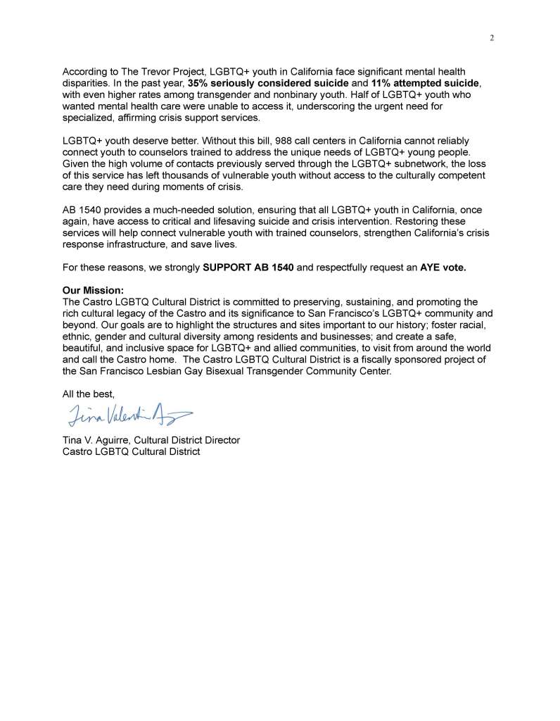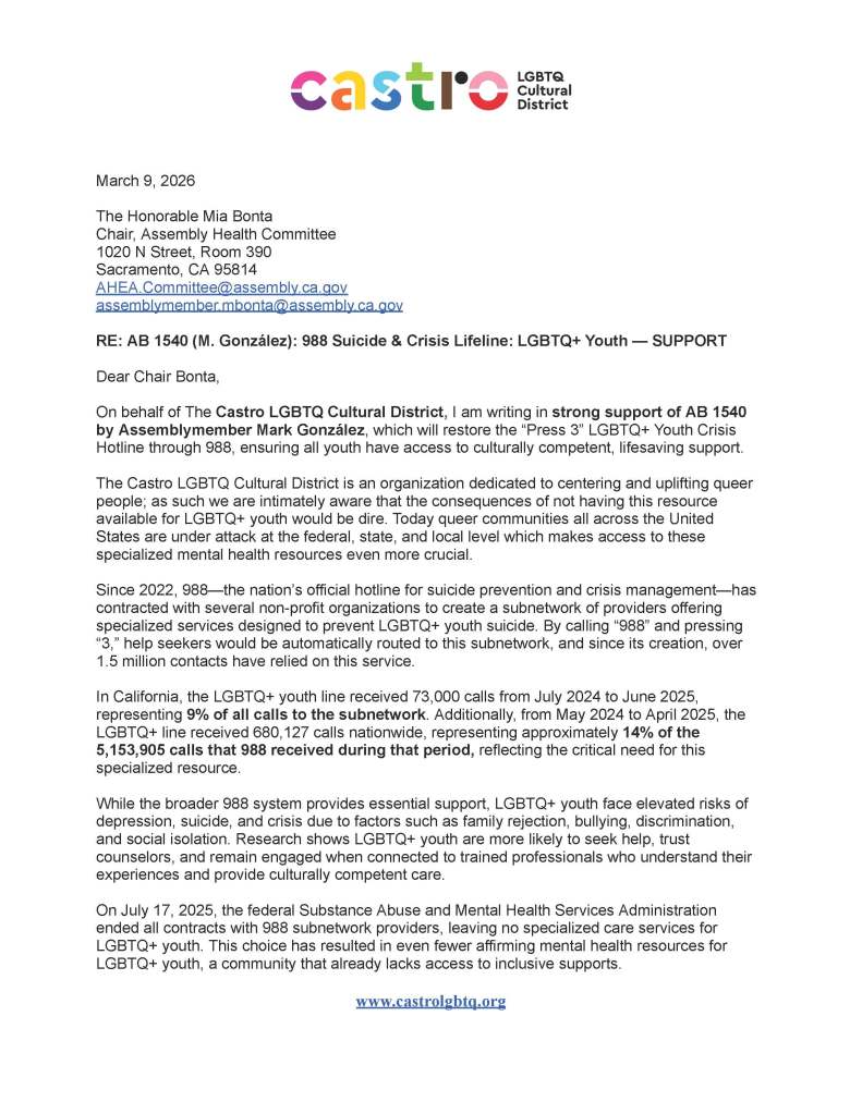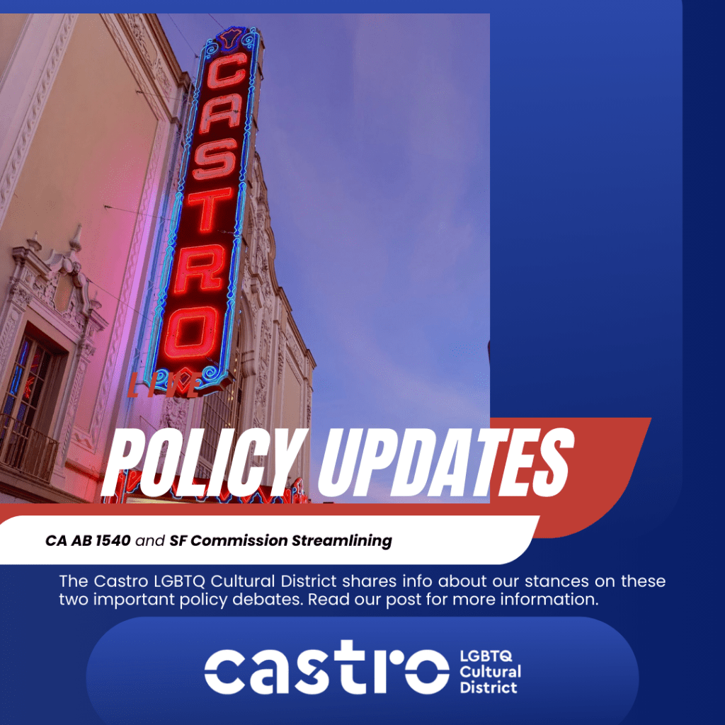 The staff and advisory board members Castro LGBTQ Cultural District share with you two policy related advocacy letters. We gave testimony at the Board of Supervisors meeting yesterday and we encourage you to USE YOUR VOICE at future hearings about this to ensure that we are able to represent ourselves as LGBTQ people via SF commissions! Please also see our letter regarding AB 1540 for the California Assembly.